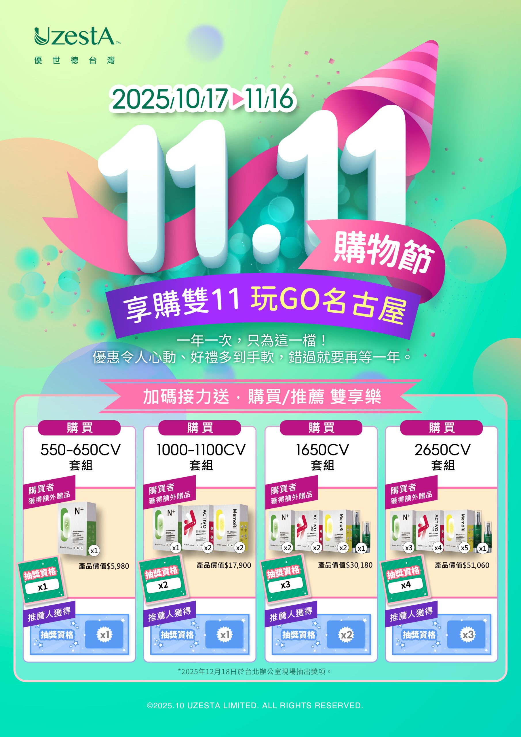 促銷, 最新消息享購雙11玩 GO名古屋2025 年 10 月 17 日 Posted by twsupport@uzesta.com 17 10 月 🛍️ 一年一度的雙11購物節,10/17-11/16優惠全面開跑。限時獻禮,這次買的不只是產品,而是「更喜歡的自己」,購買者除可獲得額外贈品,和推薦人將一同享有抽獎資格。 中獎機率100%,有機會獲得桃園-名古屋來回機票、旅行全家組、多樣旅遊好物及夢幻好禮,讓每一次購買,都成為一場驚喜與寵愛的開始!🎊