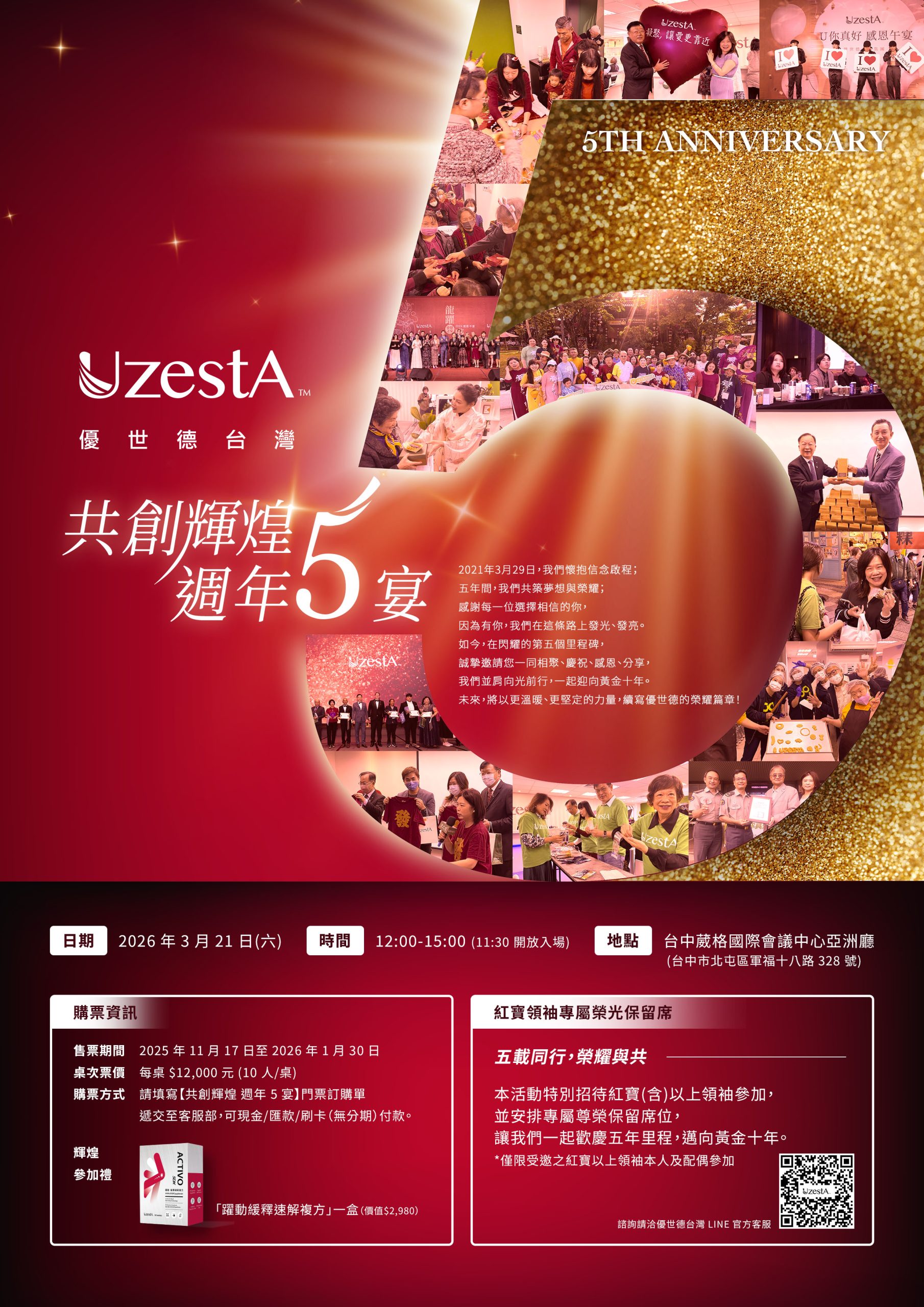 公司公告, 最新消息共創輝煌 週年5宴2025 年 11 月 18 日 Posted by Uzesta Mickey 18 11 月 五年,是一段旅程的積累;更是一道光,照亮我們前行的方向。因為相信,我們並肩同行;因為同行,我們共創榮耀。🎊每一段努力,都閃耀著光芒;每一個名字,都值得被牢記。我們誠邀您一同見證、攜手奔向輝煌的新篇章。🫶『週年5宴』門票即刻開始販售,席次有限、敬請把握!購票資訊及門票訂購單,請詳閱附檔,如有疑問或欲遞交訂購單,請洽客服人員。