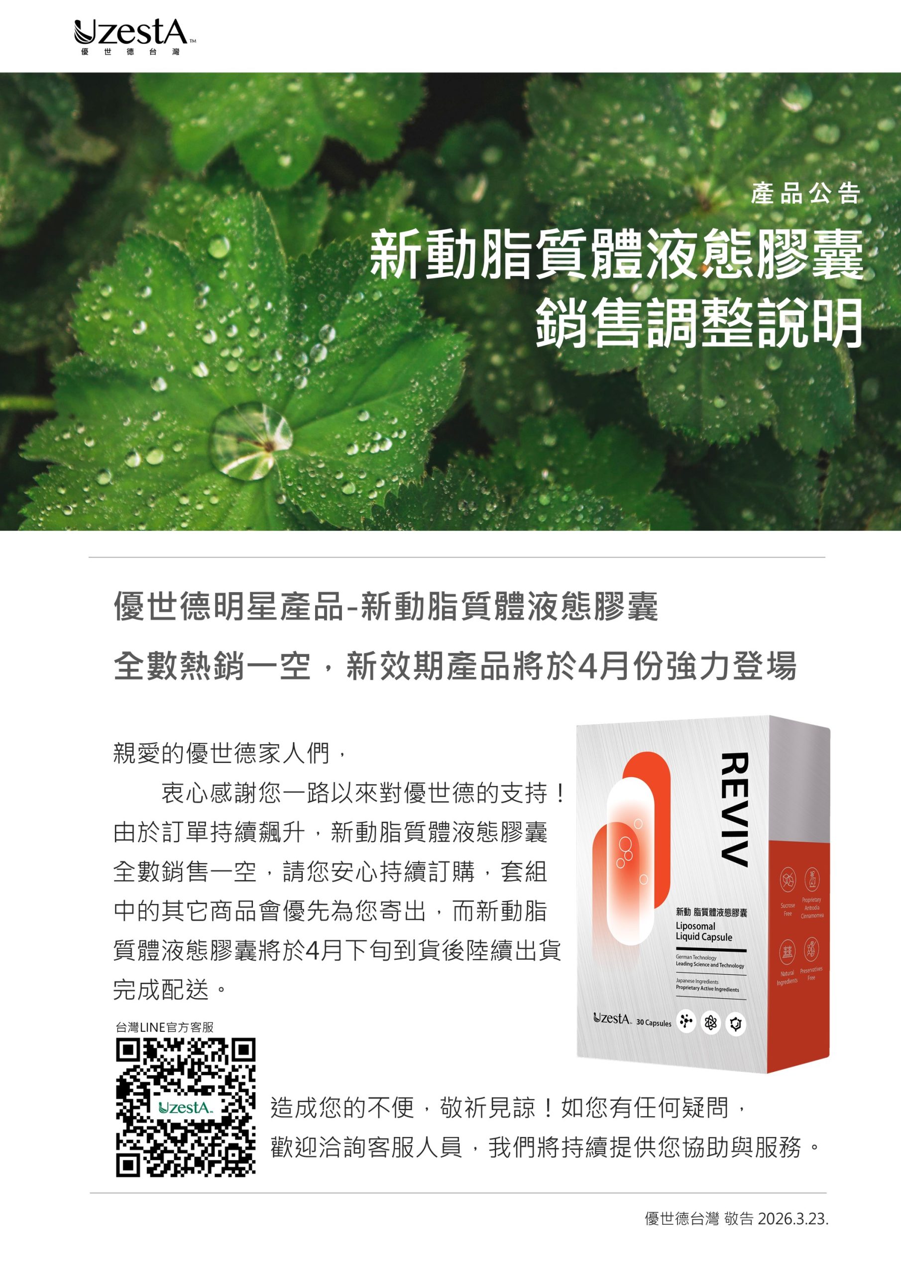 公司公告, 最新消息感謝您一直以來的支持及愛護,由於訂單爆量,新動脂質體液態膠囊全數銷售一空2026 年 3 月 24 日 Posted by Uzesta Mickey 24 3 月 親愛的領袖您好, 感謝您一直以來的支持及愛護,由於訂單爆量,新動脂質體液態膠囊全數銷售一空,預計4月下旬到貨後將陸續出貨。週年慶活動於3月29日截止,您仍可安心持續訂購,其餘產品皆會優先為您寄出。如有任何疑問,歡迎洽詢客服 !