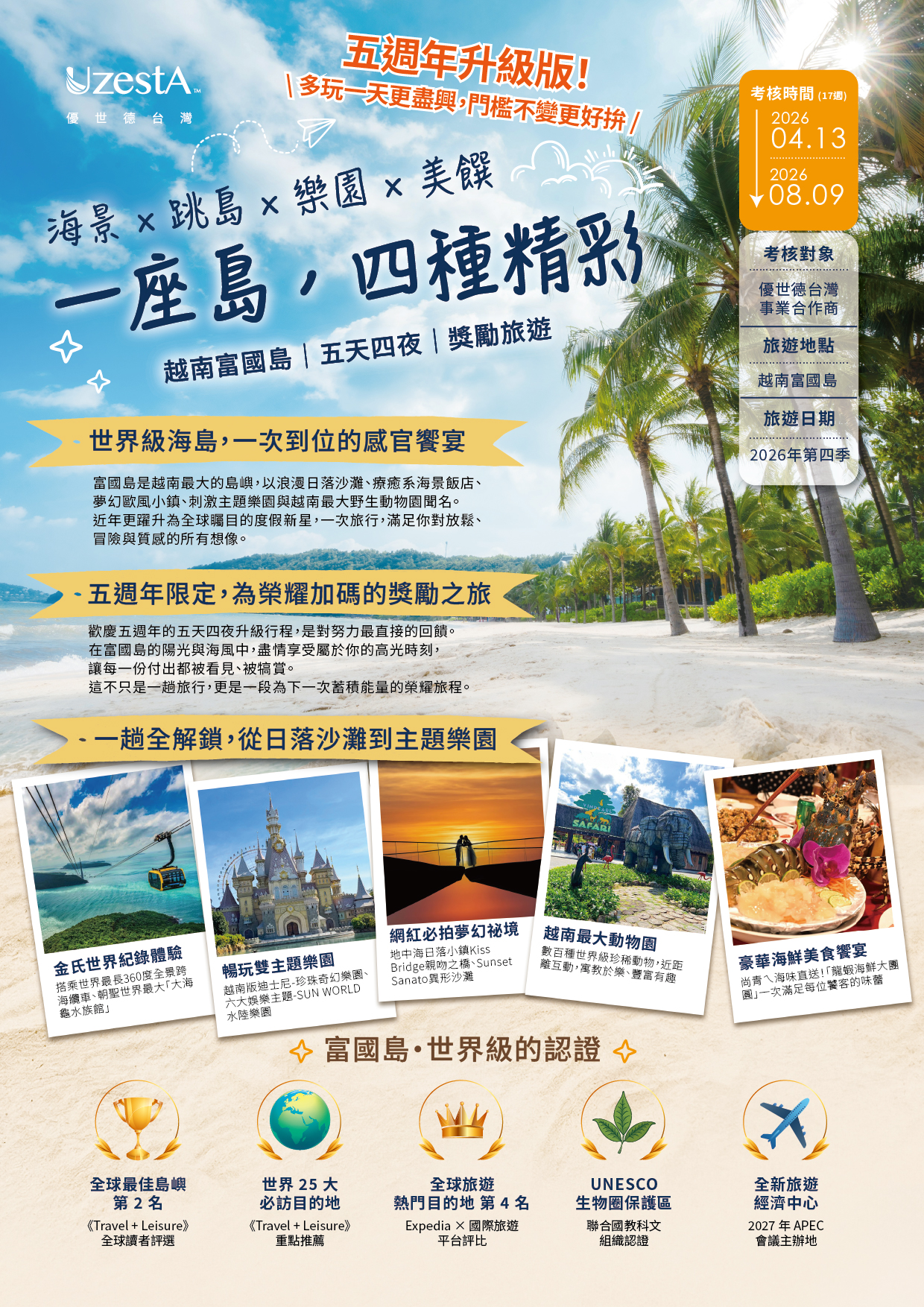 2026/04/13-2026/08/19 旅遊考核持續中,考核門檻不變、多玩一天更盡興,一座島帶給你四種不同的精彩,富國島五天四夜精彩旅程,等你一起加入!