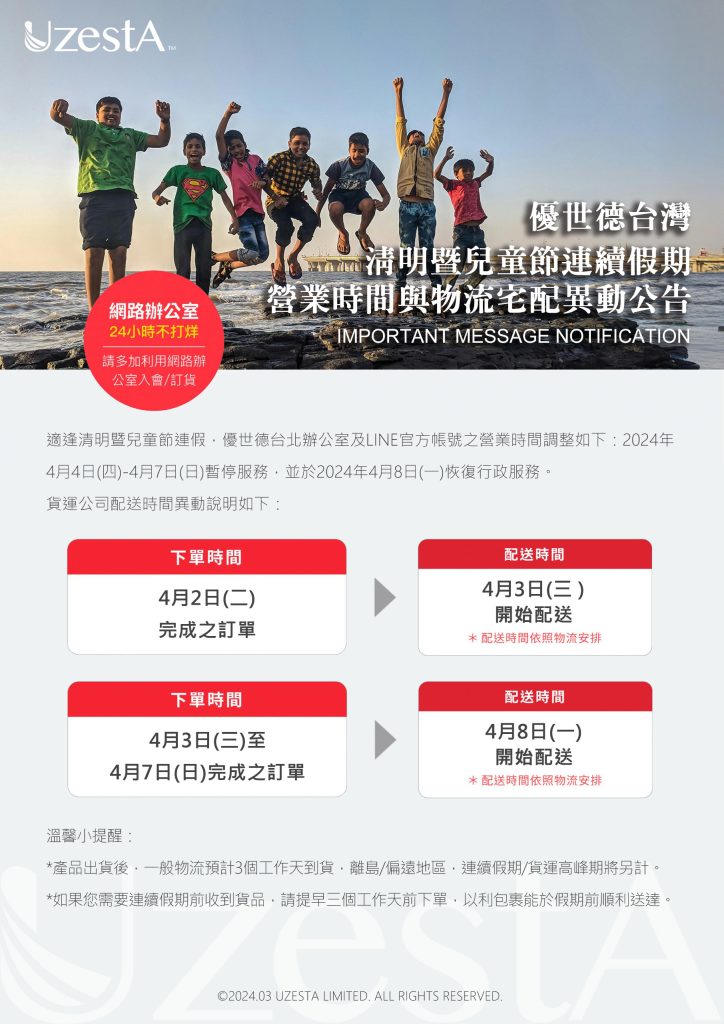 28 3 月 公司公告, 最新消息 清明暨兒童節連續假期營業時間與物流宅配異動公告2024 年 3 月 28 日 By kevin.su@uzesta.com Facebook Twitter Line WhatsApp Copy URL 適逢清明暨兒童節連假,優世德台北辦公室及LINE官方帳號之營業時間調整如下:2024年 4月4日(四)-4月7日(日)暫...繼續閱讀