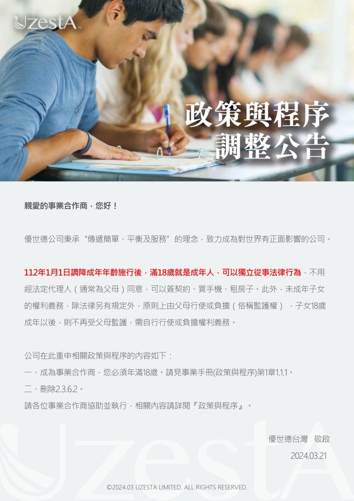21 3 月 公司公告, 最新消息 政策與程序調整公告2024 年 3 月 21 日 By kevin.su@uzesta.com Facebook Twitter Line WhatsApp Copy URL 優世德公司秉承“傳遞簡單、平衡及服務”的理念,致力成為對世界有正面影響的公司。 112年1月1日調降成年年齡施行後,滿1...繼續閱讀