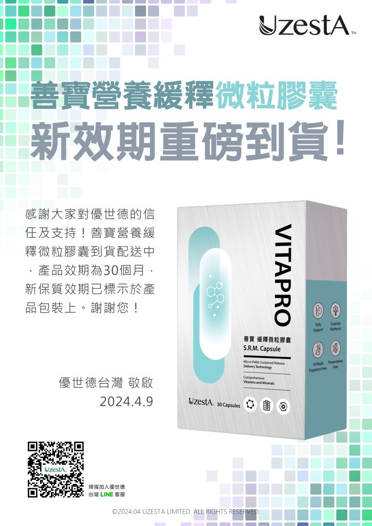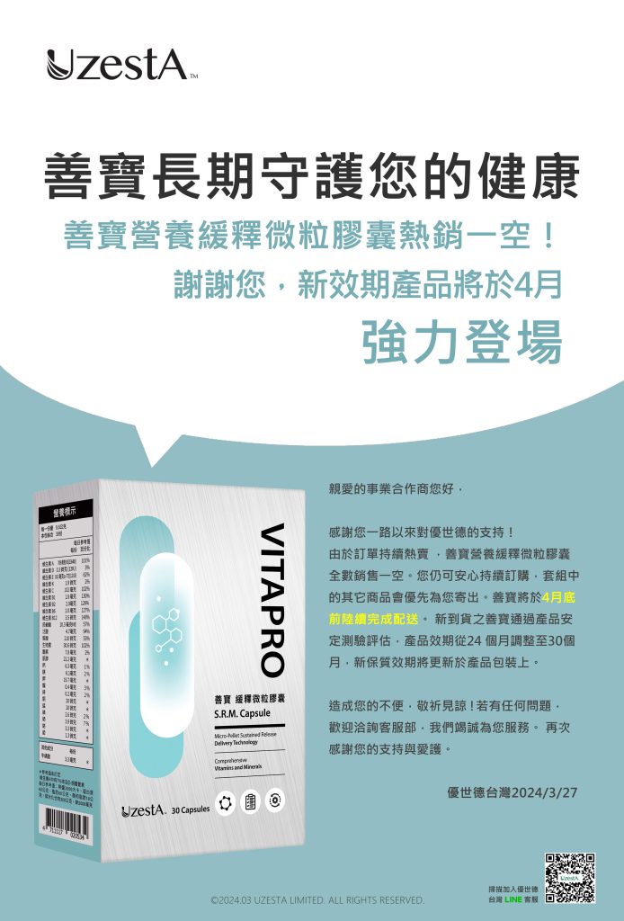 09 4 月 公司公告, 最新消息 善寶營養緩釋微粒膠囊新效期重磅到貨!2024 年 4 月 9 日 By kevin.su@uzesta.com Facebook Twitter Line WhatsApp Copy URL 感謝大家對優世德的信任及支持!善寶營養緩釋微粒膠囊到貨配送中,產品效期為30個月,新保質效期已標示於產品包裝上。謝謝您!...繼續閱讀