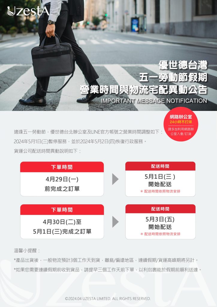 22 4 月 公司公告, 最新消息 五一勞動節假期營業時間與物流宅配異動公告2024 年 4 月 22 日 By kevin.su@uzesta.com Facebook Twitter Line WhatsApp Copy URL 適逢五一勞動節假期,優世德台北辦公室及LINE官方帳號之營業時間及物流宅配時間將有所調整繼續閱讀