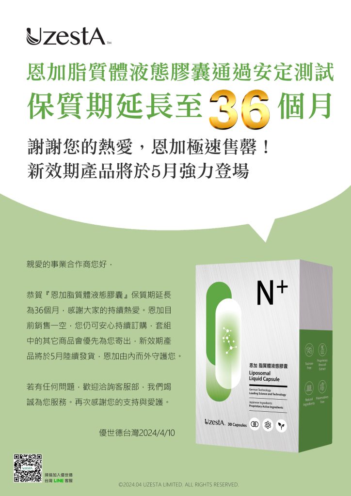 10 4 月 公司公告, 最新消息 謝謝您的熱愛,恩加極速售罄!新效期產品將於5月強力登場2024 年 4 月 10 日 By kevin.su@uzesta.com Facebook Twitter Line WhatsApp Copy URL 恩加脂質體液態膠囊通過安定測試,保質期延長至36個月。 恭賀『恩加脂質體液態膠囊』保質期延長 為36個月,感謝大家...繼續閱讀