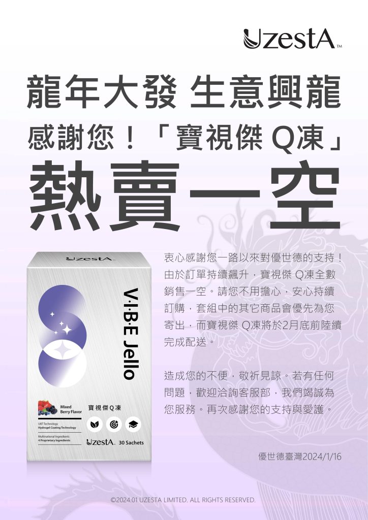 29 1 月 公司公告, 最新消息 法務公告-產品宣傳和網上銷售提示2024 年 1 月 29 日 By kevin.su@uzesta.com Facebook Twitter Line WhatsApp Copy URL 繼續閱讀