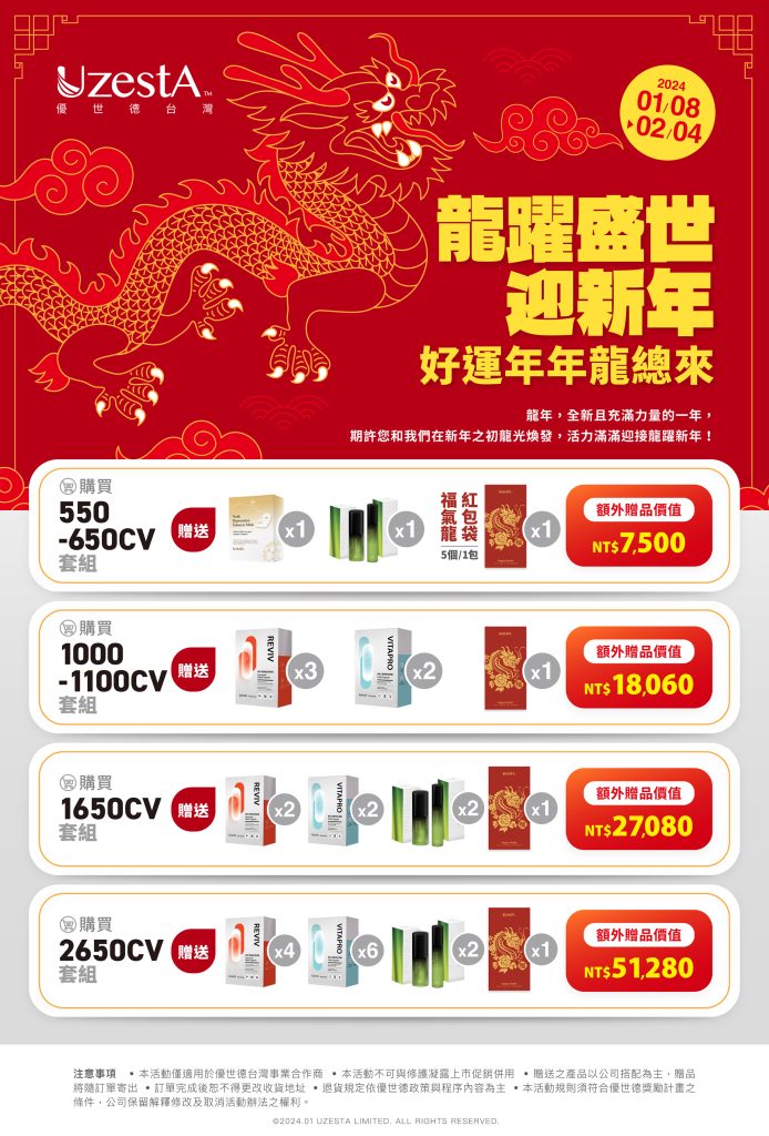 08 1 月 促銷, 最新消息 龍躍盛世迎新年 好運年年龍總來2024 年 1 月 8 日 By kevin.su@uzesta.com Facebook Twitter Line WhatsApp Copy URL 龍年,全新且充滿力量的一年。我們活力十足迎接新年,同時推出「龍躍盛世 迎新年」好禮加碼活動,並送您充滿福氣的龍年紅包袋,...繼續閱讀