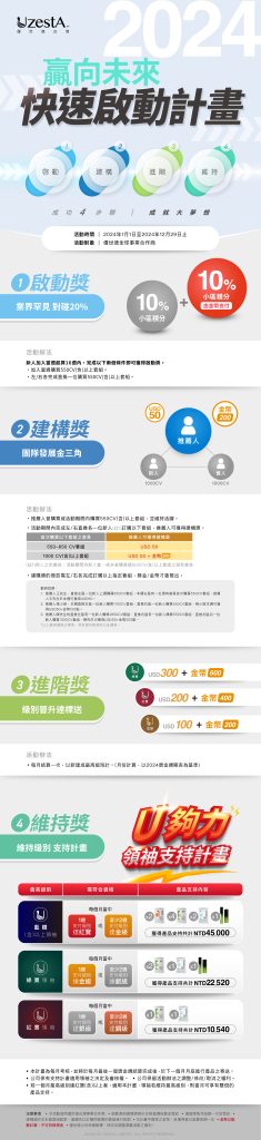 09 1 月 促銷, 最新消息 2024快速啟動計畫 重磅登場2024 年 1 月 9 日 By kevin.su@uzesta.com Facebook Twitter Line WhatsApp Copy URL 啟動️ 建構️ 進階️ 維持 成功4步驟、成就大夢想 ,相關活動辦法請詳閱附檔, 2024我們一起攜手贏未來...繼續閱讀