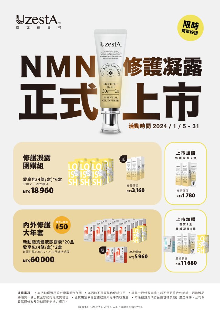 10 1 月 促銷, 最新消息 「凝」聚,讓愛更靠近 NMN修護凝露 溫暖上市2024 年 1 月 10 日 By kevin.su@uzesta.com Facebook Twitter Line WhatsApp Copy URL 歐洲百年芳療智慧、現代專利成分與科技的奇蹟之旅,令人驚艷的特點 珍貴複方精油:精心挑選,更搭配了印度乳香、真正薰衣...繼續閱讀
