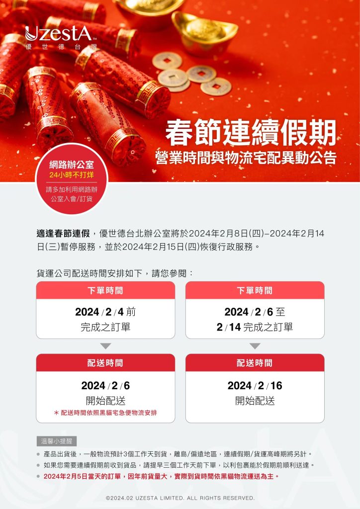 01 2 月 公司公告, 最新消息 春節假期優世德台北辦公室營業時間與宅配配送時間調整2024 年 2 月 21 日 By kevin.su@uzesta.com Facebook Twitter Line WhatsApp Copy URL 金龍賀新歲 龍攜好運來 適逢農曆春節假期,優世德台灣辦公室營業時間與宅配配送時間將有所調整繼續閱讀