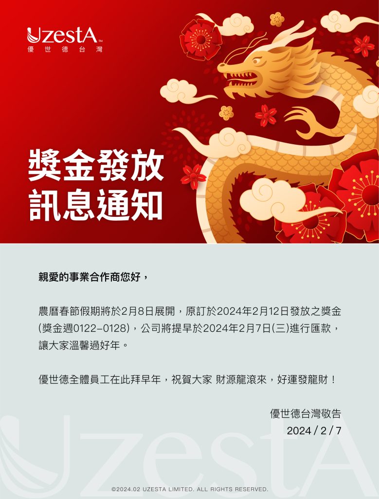 07 2 月 公司公告, 最新消息 優世德台灣 獎金發放訊息通知2024 年 2 月 7 日 By kevin.su@uzesta.com Facebook Twitter Line WhatsApp Copy URL 農曆春節假期將於2月8日展開,原訂於2024年2月12日發放之獎金 (獎金週0122-0128),公司將提早於2024年...繼續閱讀