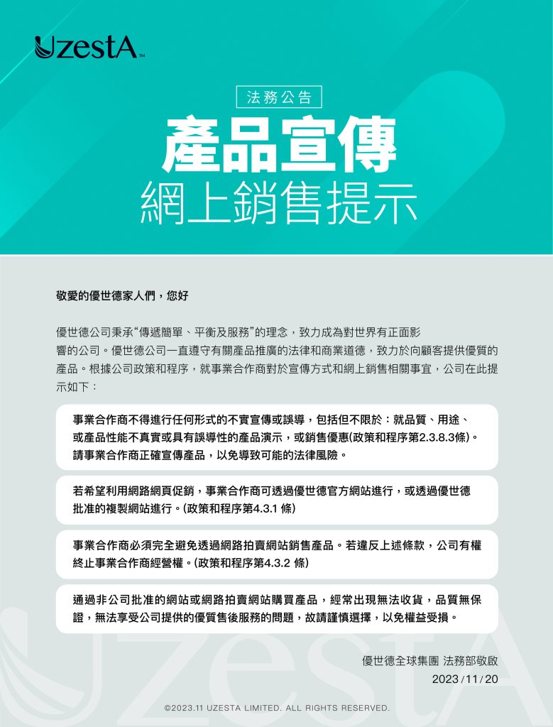 20 11 月 公司公告, 最新消息 法務公告-產品宣傳網上銷售提示2023 年 11 月 20 日 By kevin.su@uzesta.com Facebook Twitter Line WhatsApp Copy URL 優世德公司秉承“傳遞簡單、平衡及服務”的理念,致力成為對世界有正面影響的公司。優世德公司一直遵守有關產品推廣的法律和商業...繼續閱讀