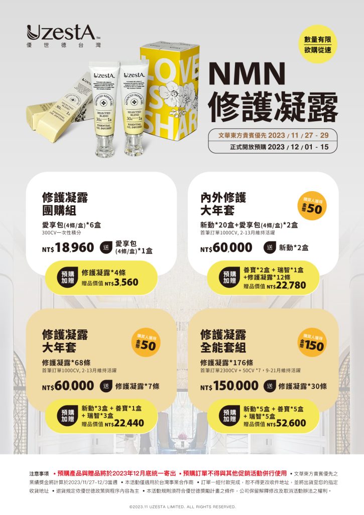 28 11 月 促銷, 最新消息 NMN修護凝露預購正式開跑2023 年 11 月 28 日 By kevin.su@uzesta.com Facebook Twitter Line WhatsApp Copy URL NMN修護凝露預購正式開跑繼續閱讀