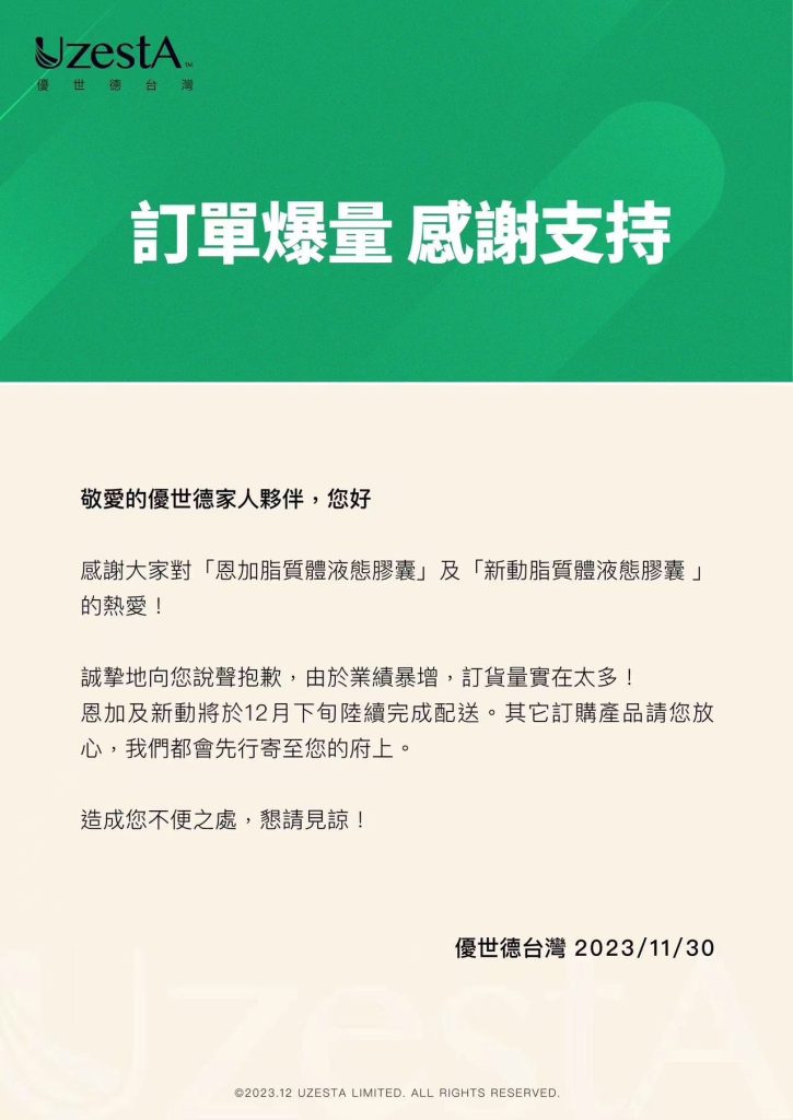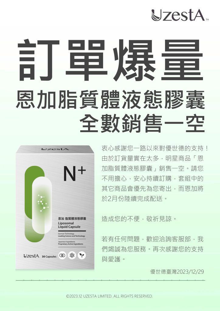29 12 月 公司公告, 最新消息 訂單爆量「恩加脂質體液態膠囊」全數銷售一空2023 年 12 月 29 日 By kevin.su@uzesta.com Facebook Twitter Line WhatsApp Copy URL 衷心感謝您一路以來對優世德的支持!由於訂貨量實在太多,明星商品「恩加脂質體液態膠囊」銷售一空。請您不用擔心,安心持續訂購...繼續閱讀