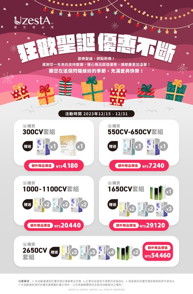 15 12 月 促銷, 最新消息 狂歡聖誕,優惠不斷!2023 年 12 月 15 日 By kevin.su@uzesta.com Facebook Twitter Line WhatsApp Copy URL 願您在這個閃耀繽紛的季節,充滿愛與快樂!️ 優世德感謝您一年來的支持愛護,暖心推出超值優惠,讓節慶更加溫馨!繼續閱讀