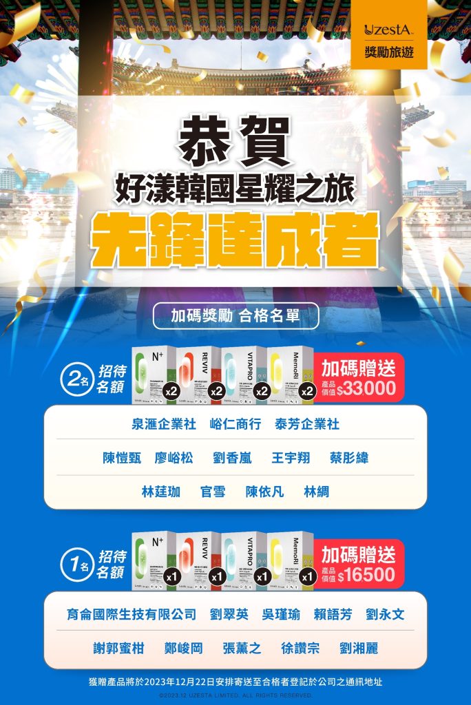 22 12 月 公司公告, 最新消息 熱烈恭喜「好漾韓國 星耀之旅」先鋒達成者,在12/10已率先獲得旅遊招待名額及加碼獎勵!2023 年 12 月 22 日 By kevin.su@uzesta.com Facebook Twitter Line WhatsApp Copy URL 活動贈品將陸續寄出,同時旅遊考核持續進行中,2024我們一起前進韓國!繼續閱讀
