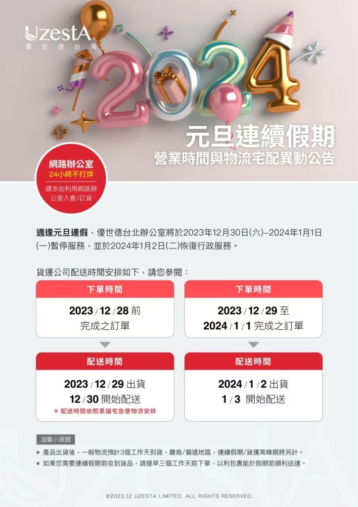 29 12 月 公司公告, 最新消息 優世德台灣公司元旦連續假期公告2023 年 12 月 29 日 By kevin.su@uzesta.com Facebook Twitter Line WhatsApp Copy URL 2023/12/30-2024/1/1 適逢元旦連續假期, 優世德台灣公司營業時間將有所調整, 相關訊息請參閱附檔假期...繼續閱讀