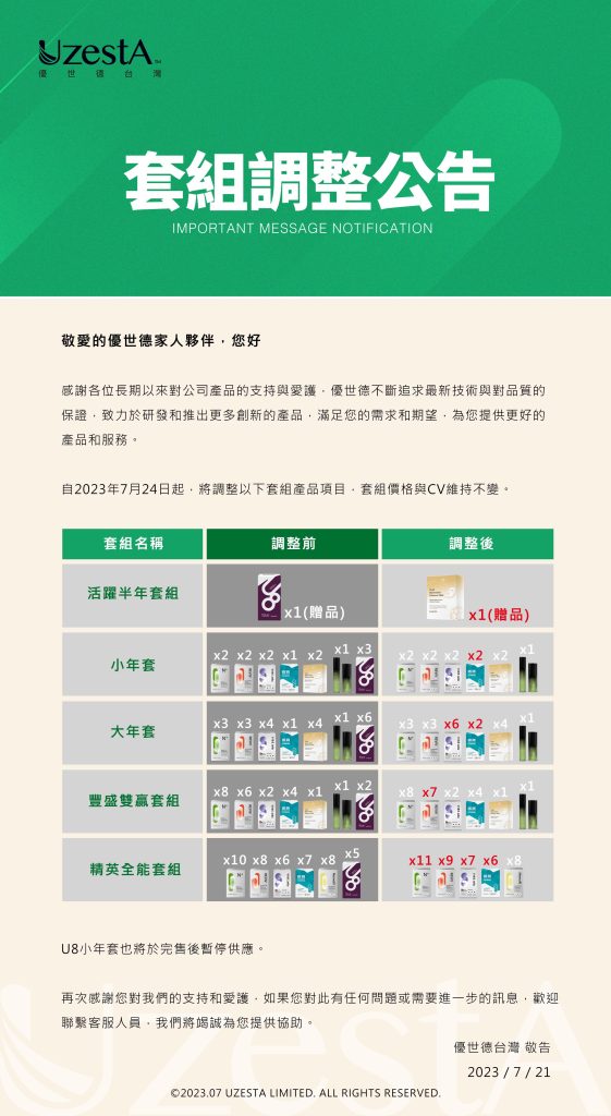 21 7 月 公司公告, 最新消息 套組調整公告2023 年 7 月 21 日 By kevin.su@uzesta.com Facebook Twitter Line WhatsApp Copy URL 繼續閱讀