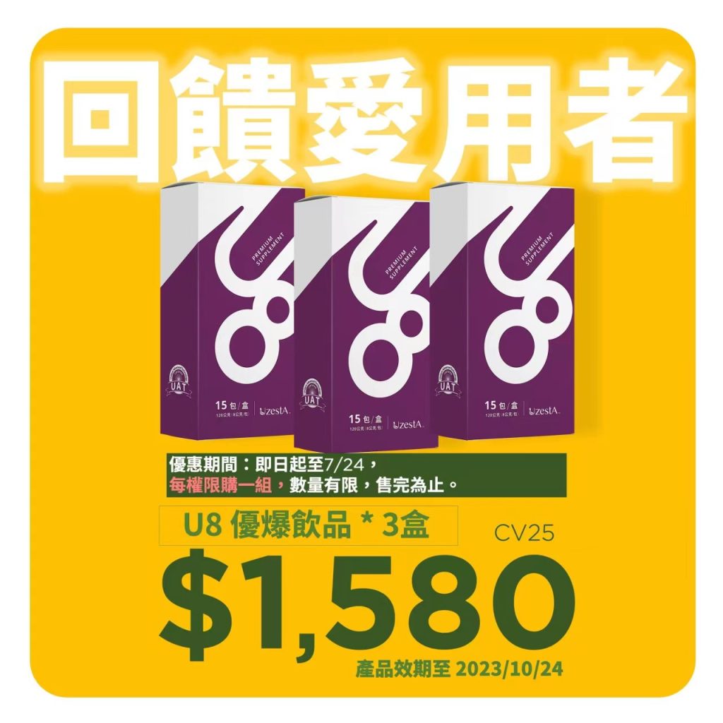 12 7 月 促銷, 最新消息 U8優爆飲品3盒 只要新台幣1,580元!2023 年 7 月 12 日 By kevin.su@uzesta.com Facebook Twitter Line WhatsApp Copy URL 感謝優世德家人對U8產品的支持與愛護! 即日起至2023/7/24止,為回饋愛用者,凡購買U8優爆飲品3盒 只要新台幣...繼續閱讀