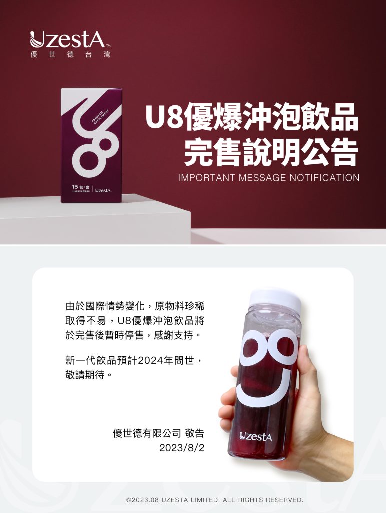 02 8 月 公司公告, 最新消息 U8優爆沖泡飲品完售說明公告2023 年 8 月 2 日 By kevin.su@uzesta.com Facebook Twitter Line WhatsApp Copy URL 由於國際情勢變化,原物料珍稀取得不易,U8優爆沖泡飲品將於完售後暫時停售,感謝支持。 新一代飲品預計2024年問世 敬...繼續閱讀