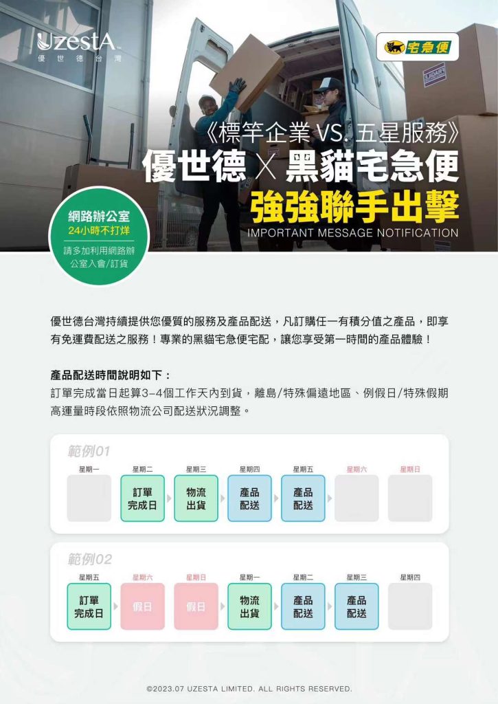 07 8 月 公司公告, 最新消息 優世德 X 黑貓宅急便 強強聯手出擊2023 年 8 月 7 日 By kevin.su@uzesta.com Facebook Twitter Line WhatsApp Copy URL 優世德台灣持續提供您優質的服務及產品配送,凡訂購任一有積分值之產品,即享有免運費配送之服務! 專業的黑貓宅急便宅配,讓...繼續閱讀