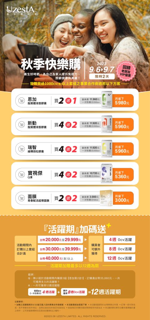 06 9 月 促銷, 最新消息 【秋季快樂購】回饋老朋友VIP優惠2023 年 9 月 6 日 By kevin.su@uzesta.com Facebook Twitter Line WhatsApp Copy URL 凡曾購買過1000CV(含)以上套組之事業合作商皆可以享受超值優惠喔! 9/6-9/7 限時2天,買產品送產品,再加碼...繼續閱讀