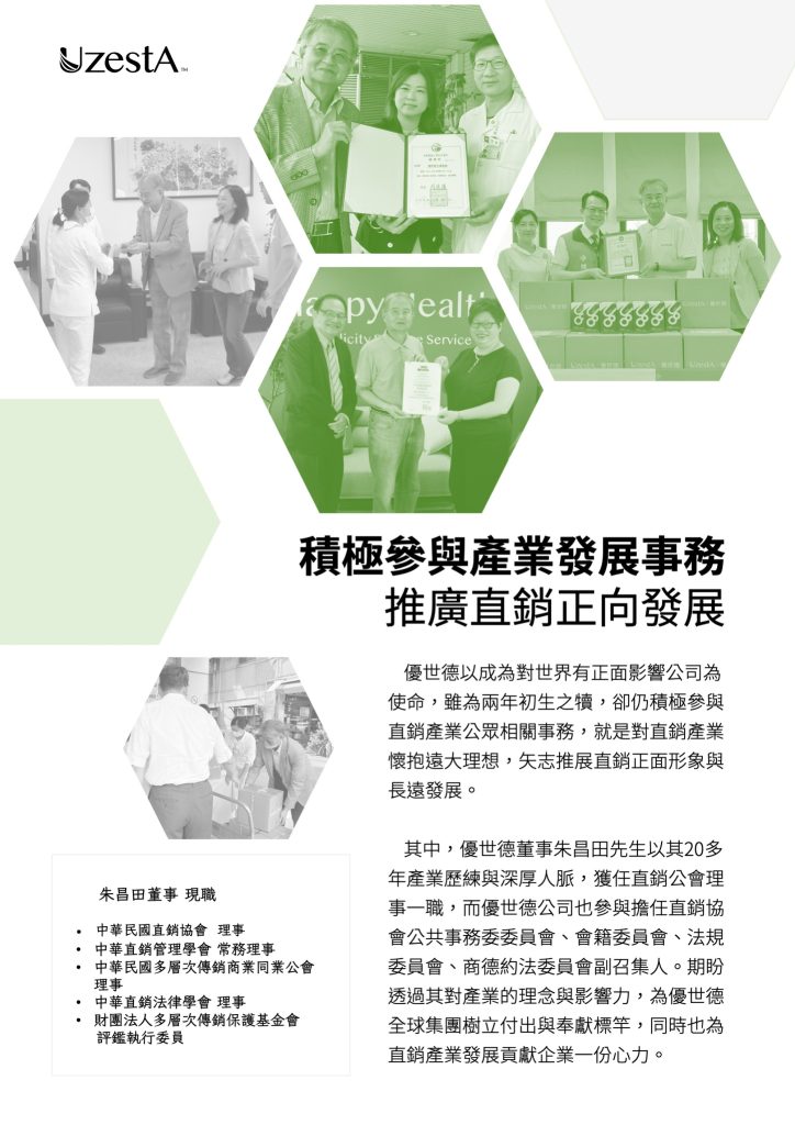 13 9 月 公司公告, 最新消息 優世德董事朱昌田先生獲任直銷公會理事一職2023 年 9 月 13 日 By kevin.su@uzesta.com Facebook Twitter Line WhatsApp Copy URL 優世德成立以來,致力成為對世界有正面影響的公司。成立至今只有兩年多的時間,積極參與直銷產業公眾相關事務。 其中,優...繼續閱讀