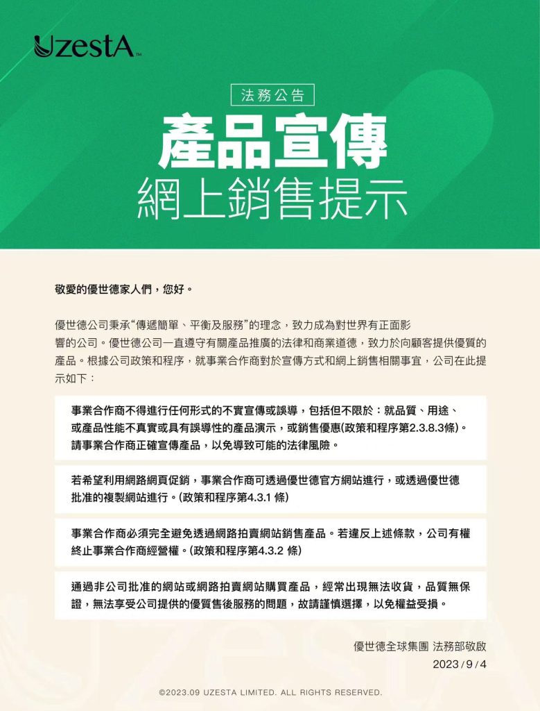 13 9 月 公司公告, 最新消息 法務公告-產品宣傳網上銷售提示2023 年 9 月 13 日 By kevin.su@uzesta.com Facebook Twitter Line WhatsApp Copy URL 優世德公司秉承“傳遞簡單、平衡及服務”的理念,致力成為對世界有正面影響的公司。優世德公司一直遵守有關產品推廣的法律和商業...繼續閱讀