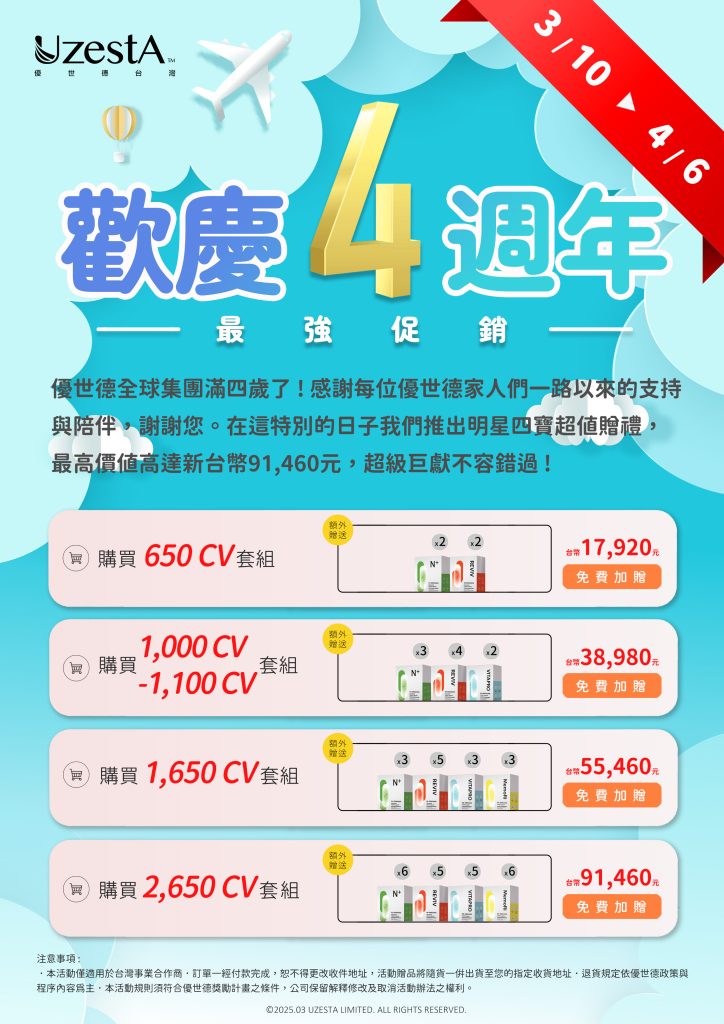 07 3 月 促銷, 最新消息 歡慶4週年 年度超值巨獻2025 年 3 月 7 日 By kevin.su@uzesta.com Facebook Twitter Line WhatsApp Copy URL 優世德全球集團即將滿4歲了! 感謝所有優世德家人一路的支持與陪伴,在歡慶4週年的時刻,優世德台灣公司推出年度重磅優惠。 ...繼續閱讀