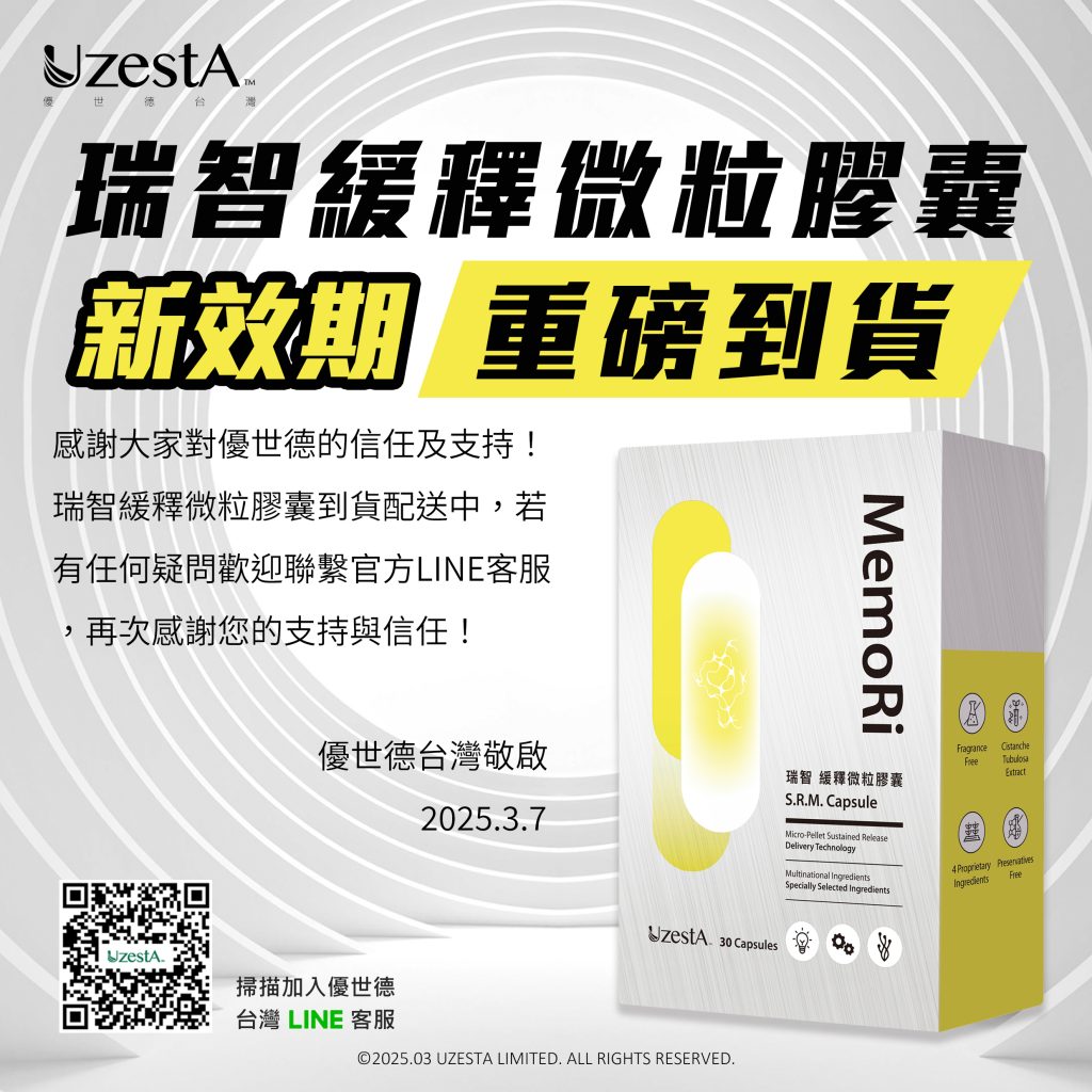 10 3 月 公司公告, 最新消息 瑞智緩釋微粒膠囊 新效期重磅到貨2025 年 3 月 10 日 By kevin.su@uzesta.com Facebook Twitter Line WhatsApp Copy URL 感謝大家對優世德的信任及支持! 瑞智緩釋微粒膠囊到貨配送中,若有任何疑問歡迎聯繫客服,再次感謝您的支持與信任! ...繼續閱讀