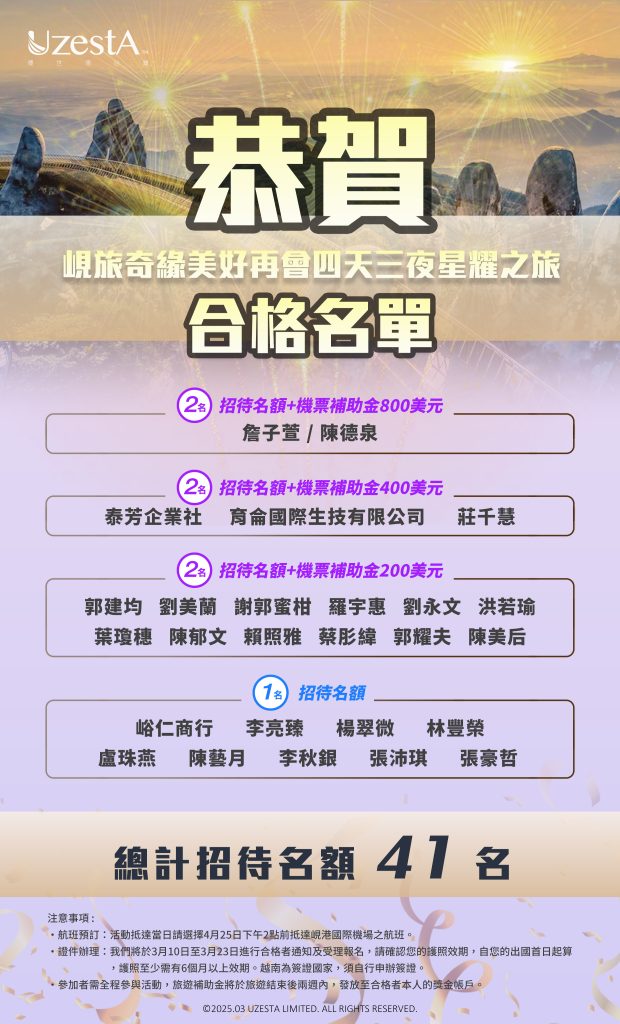 10 3 月 公司公告, 最新消息 【峴旅奇緣 美好再會 星耀之旅】考核名單出爐!2025 年 3 月 10 日 By kevin.su@uzesta.com Facebook Twitter Line WhatsApp Copy URL 恭喜星耀之旅考核達成之領袖,我們的峴港之旅即將於2025年4月25日至4月28日熱烈舉行。 一段開啟文化與美味的體...繼續閱讀