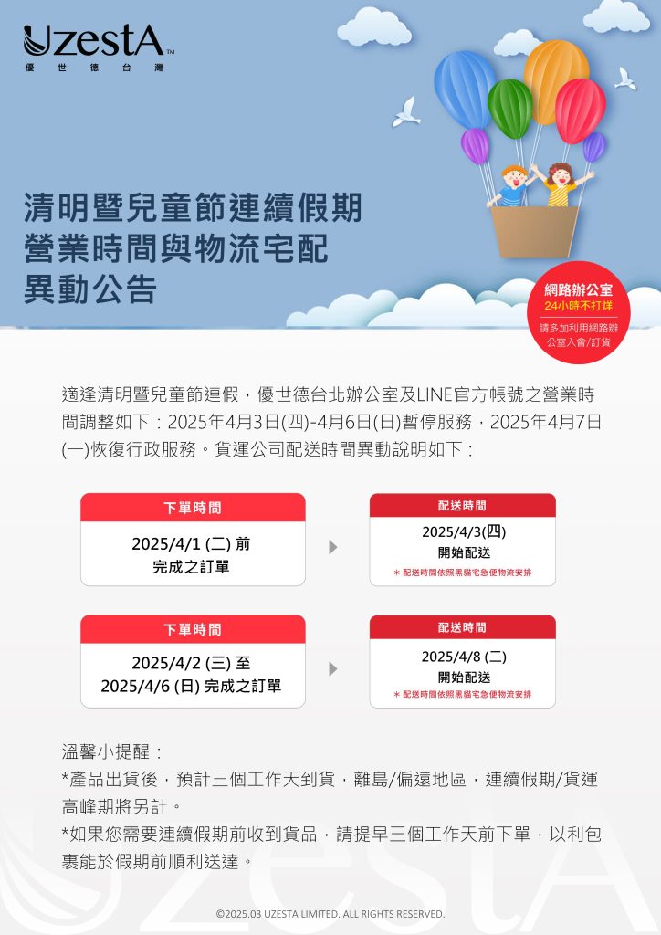 28 3 月 公司公告, 最新消息 清明暨兒童節連續假期營業時間與物流宅配異動公告2025 年 3 月 28 日 By kevin.su@uzesta.com Facebook Twitter Line WhatsApp Copy URL 適逢清明暨兒童節連假,優世德台北辦公室及LINE官方帳號之營業時間調整如下:繼續閱讀
