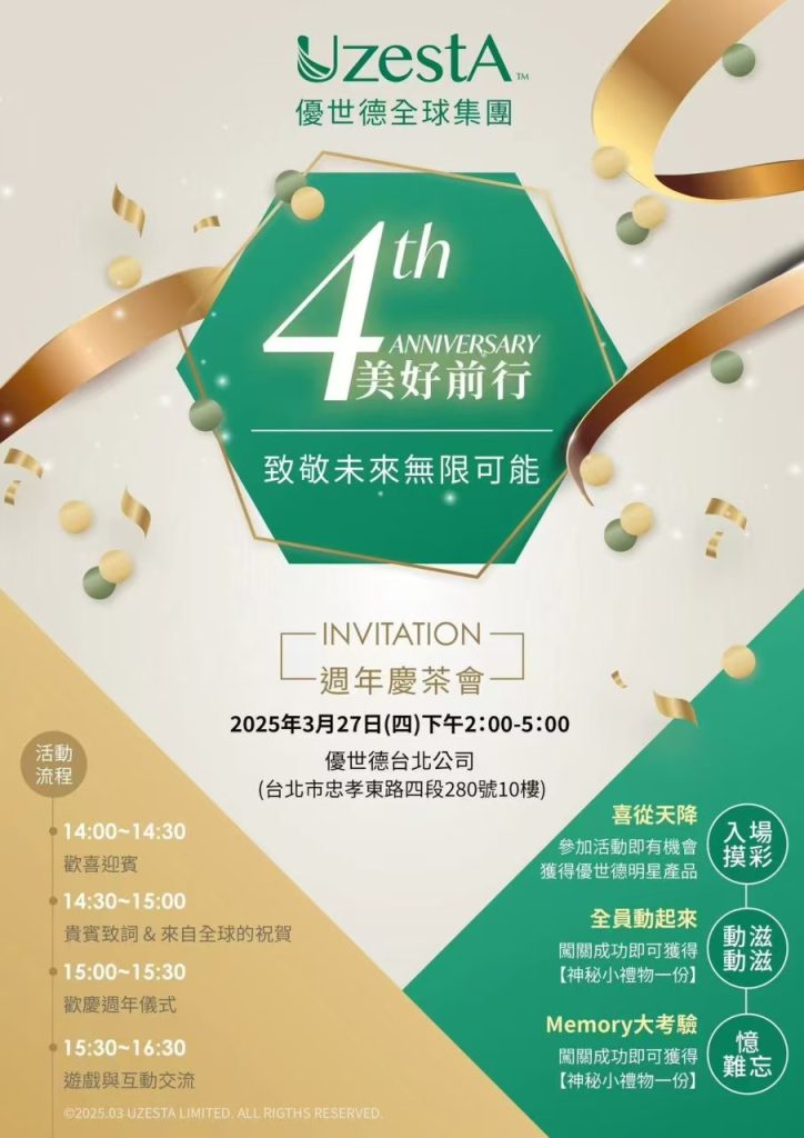 10 3 月 公司公告, 最新消息 優世德全球集團4週年慶2025 年 3 月 10 日 By kevin.su@uzesta.com Facebook Twitter Line WhatsApp Copy URL 優世德全球集團成立4年以來,我們懷抱熱忱、從起點走到現在,感謝大家的支持與陪伴,我們不斷成長,創造精彩,這一路走來,滿是...繼續閱讀