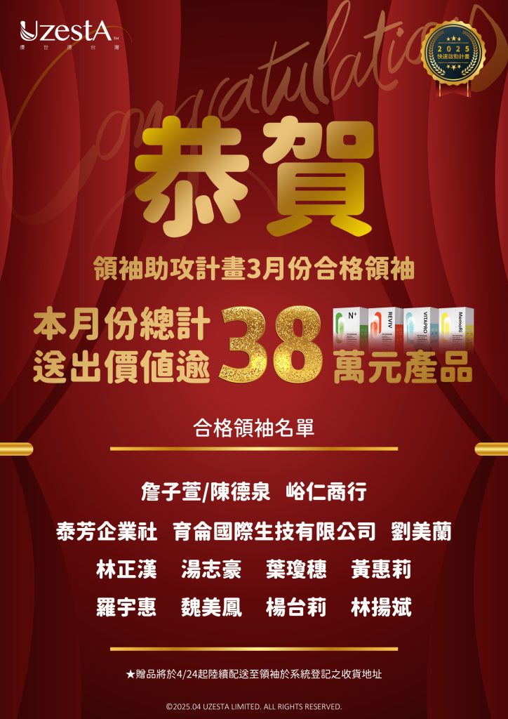 23 4 月 公司公告, 最新消息 U夠力領袖助攻計畫 2025年度3月份合格領袖2025 年 4 月 23 日 By kevin.su@uzesta.com Facebook Twitter Line WhatsApp Copy URL 總計送出價值超過38萬元產品,公司持續支持領袖、讓您巿場推廣更有力!繼續閱讀