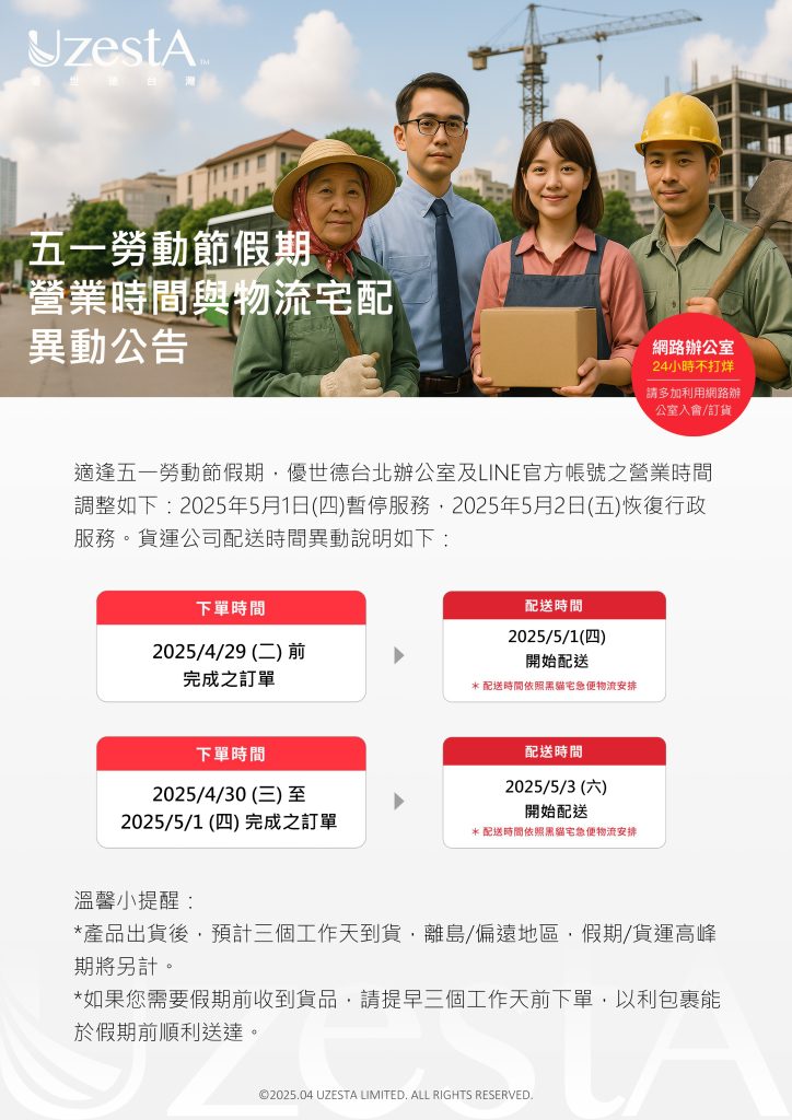 25 4 月 公司公告, 最新消息 五一勞動節假期營業時間與物流宅配異動公告2025 年 4 月 25 日 By kevin.su@uzesta.com Facebook Twitter Line WhatsApp Copy URL 適逢五一勞動節假期,優世德台北辦公室及LINE官方帳號之營業時間及物流宅配時間將有所調整繼續閱讀