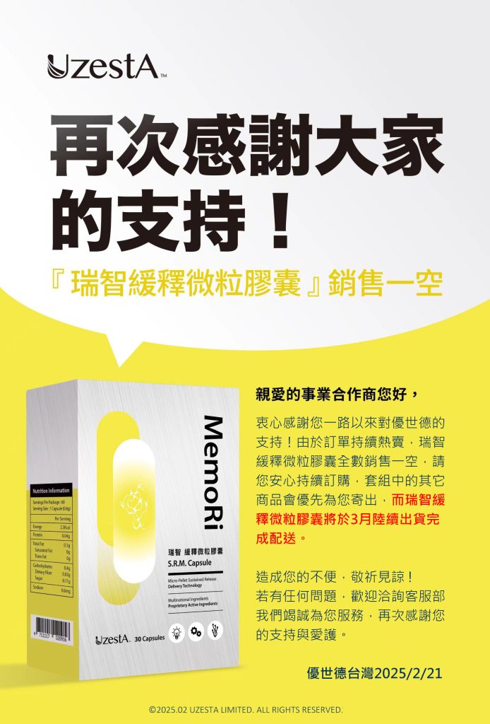 21 2 月 公司公告, 最新消息 再次感謝大家的支持 瑞智緩釋微粒膠囊銷售一空2025 年 2 月 21 日 By kevin.su@uzesta.com Facebook Twitter Line WhatsApp Copy URL 再次感謝大家的支持 瑞智緩釋微粒膠囊銷售一空繼續閱讀