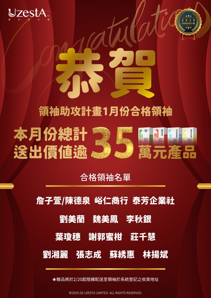 17 2 月 公司公告, 最新消息 U夠力領袖助攻計畫 2025年度1月份合格領袖2025 年 2 月 17 日 By kevin.su@uzesta.com Facebook Twitter Line WhatsApp Copy URL 總計送出價值超過35萬元產品,公司持續支持領袖、讓您巿場推廣更有力! 繼續閱讀