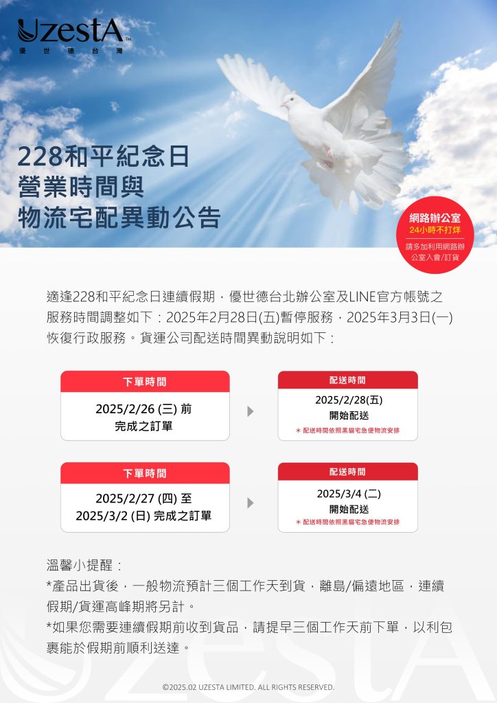 21 2 月 公司公告, 最新消息 228和平紀念日優世德台北辦公室服務時間調整2025 年 2 月 21 日 By kevin.su@uzesta.com Facebook Twitter Line WhatsApp Copy URL 適逢228和平紀念日假期,優世德台灣台北辦公室及LINE官方帳號之服務時間將有所調整,相關訊息請參閱附檔假期公告,並預祝...繼續閱讀