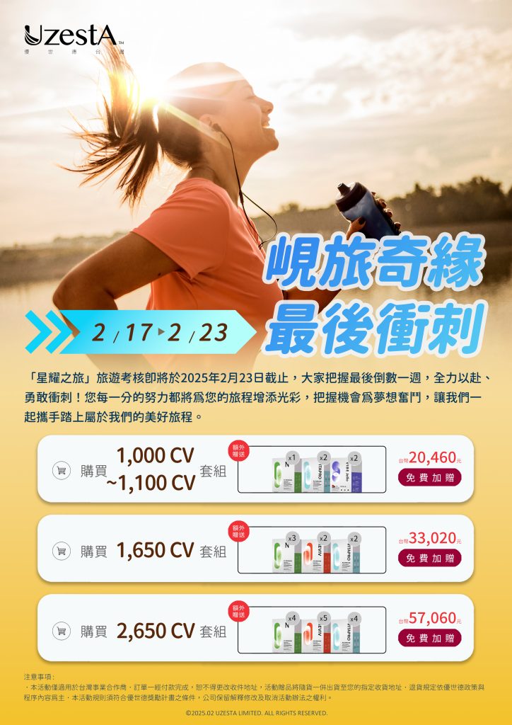17 2 月 促銷, 最新消息 星耀之旅旅遊考核 即將於2025年2月23日截止2025 年 2 月 17 日 By kevin.su@uzesta.com Facebook Twitter Line WhatsApp Copy URL 大家把握最後倒數一週,全力以赴、勇敢衝刺! 您每一分的努力都將為您的旅程增添光彩,把握機會為夢想奮門,讓我們一起攜手踏...繼續閱讀