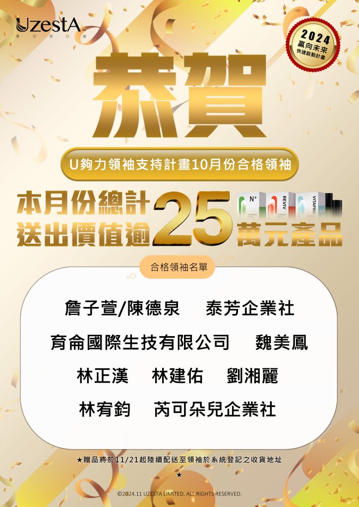 18 11 月 公司公告, 最新消息 熱烈恭賀U夠力領袖支持計畫 10月份合格領袖2024 年 11 月 18 日 By kevin.su@uzesta.com Facebook Twitter Line WhatsApp Copy URL 10月總計送出價值超過25萬元產品,持續支持領袖、讓您巿場推廣更有力! 產品將於11/21起陸續配送!繼續閱讀