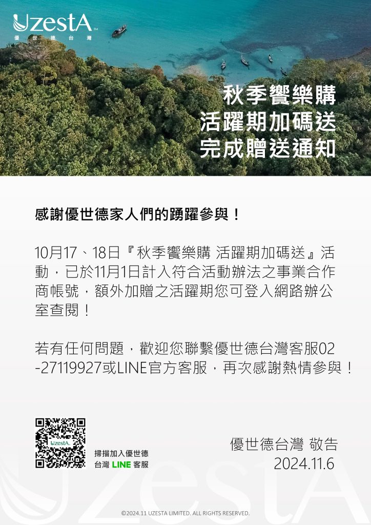 06 11 月 公司公告, 最新消息 秋季饗樂購活躍期加碼送 完成贈送通知2024 年 11 月 6 日 By kevin.su@uzesta.com Facebook Twitter Line WhatsApp Copy URL 10月17、18日『秋季饗樂購 活躍期加碼送』活動,已於11月1日計入符合活動辦法之事業合作商帳號,額外加贈之活躍期您可...繼續閱讀