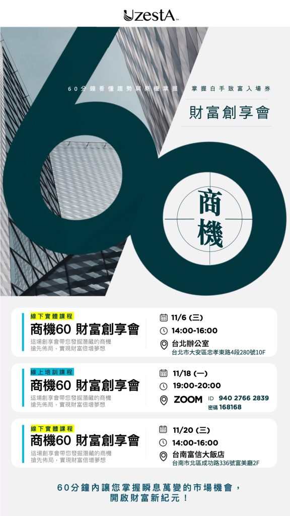 04 11 月 公司公告, 最新消息 財富創享會2024 年 11 月 4 日 By kevin.su@uzesta.com Facebook Twitter Line WhatsApp Copy URL 60分鐘看懂趨勢與商機掌握 掌握白手致富入場劵繼續閱讀