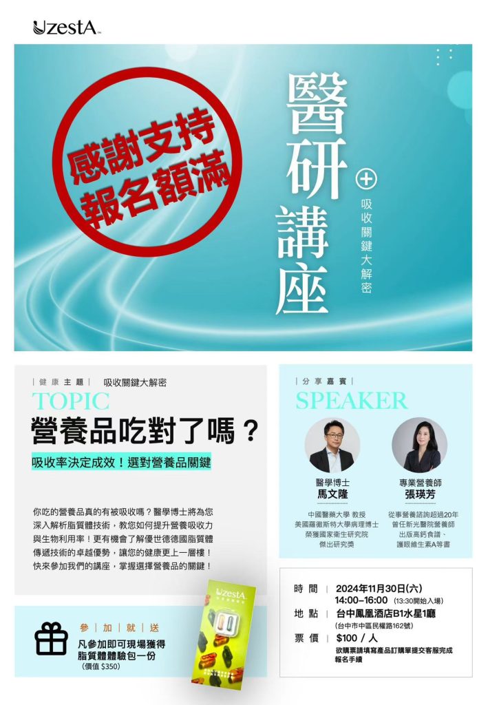 21 11 月 公司公告, 最新消息 感謝支持『11/30醫研講座』報名額滿2024 年 11 月 21 日 By kevin.su@uzesta.com Facebook Twitter Line WhatsApp Copy URL 您吃對營養品了嗎?您吃的營養品真的有被吸收嗎?馬文隆醫學博士、Gloria營養師,將為大家帶來吸收關鍵大解密,11/30...繼續閱讀