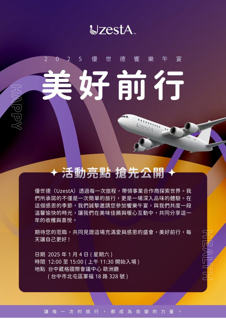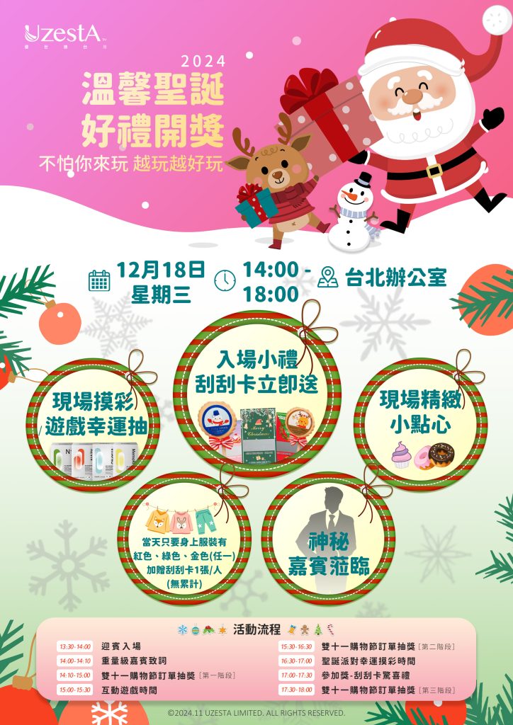 27 11 月 公司公告, 最新消息 歡樂滿滿的聖誕季來臨了2024 年 11 月 27 日 By kevin.su@uzesta.com Facebook Twitter Line WhatsApp Copy URL 在這個充滿歡樂與溫馨的日子,邀請所有夥伴和家人一起加入台北耶誕派對。現場不僅有精緻的耶誕小點心、入場小禮、遊戲摸彩,更有...繼續閱讀