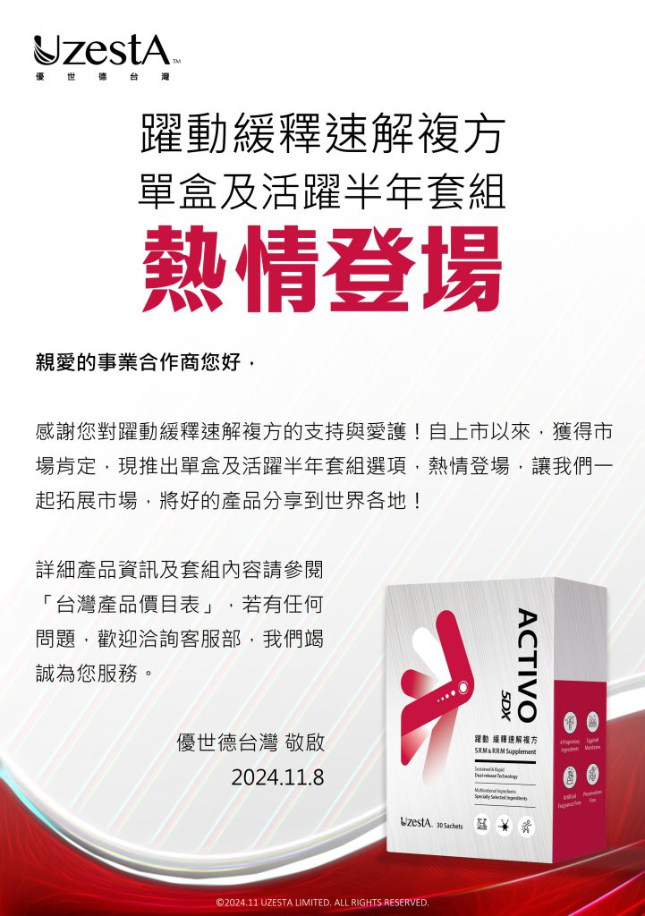 08 11 月 公司公告, 最新消息 躍動緩釋速解複方單盒及活躍半年套組 熱情登場2024 年 11 月 8 日 By kevin.su@uzesta.com Facebook Twitter Line WhatsApp Copy URL 感謝您對躍動緩釋速解複方的支持與愛護!自上市以來,獲得市場肯定,現推出單盒及活躍半年套組選項,熱情登場,讓我們一起拓展市...繼續閱讀