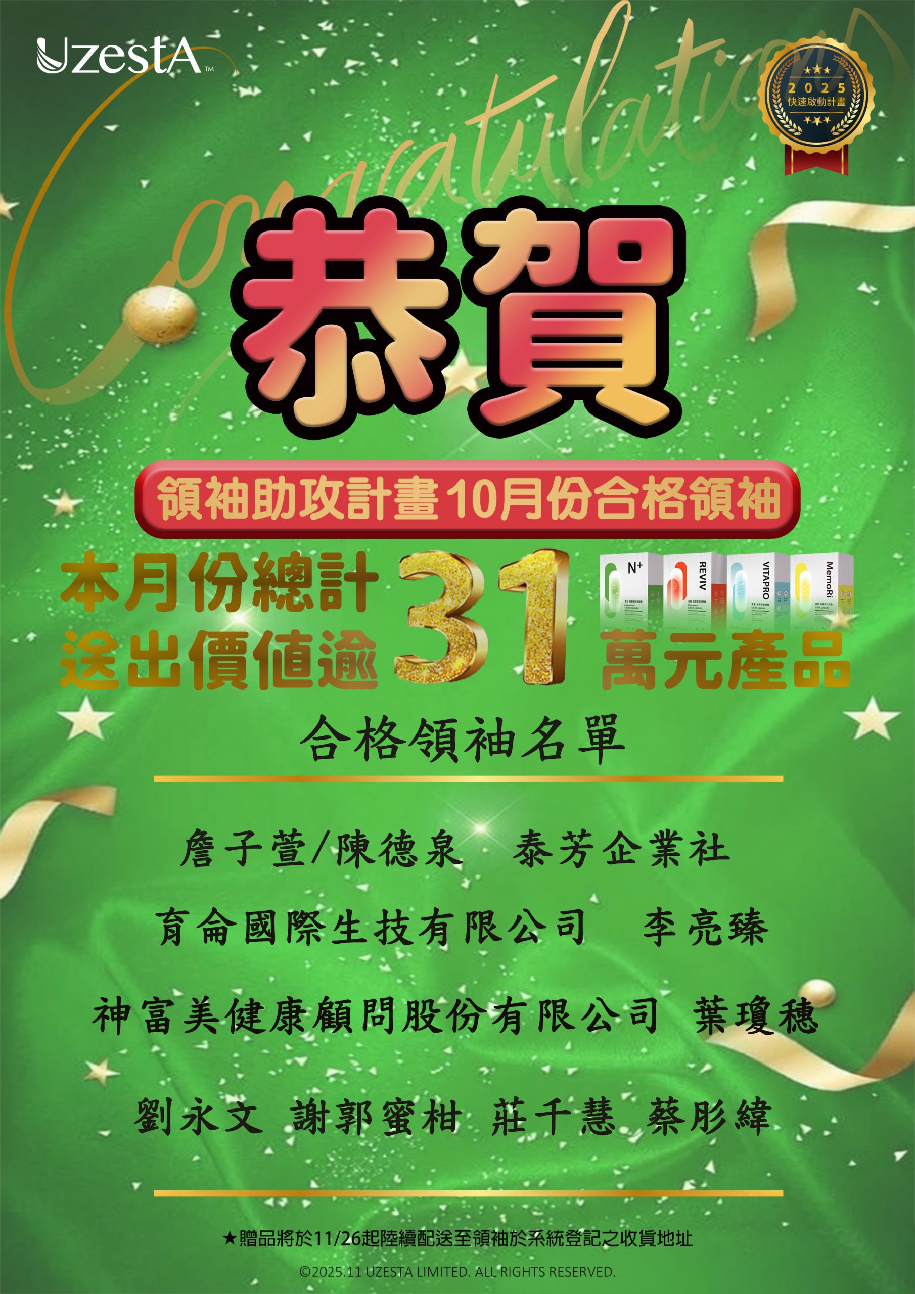 最新消息, 表揚U夠力領袖助攻計畫 2025年度10月份合格領袖2025 年 11 月 19 日 Posted by Uzesta Mickey 19 11 月 🎉🎉 熱烈恭賀🎉🎉 2025領袖助攻計畫 10月合格領袖總計送出價值超過31萬元產品,公司持續支持領袖,讓您巿場推廣更有力!▶️產品將於11/26起陸續配送