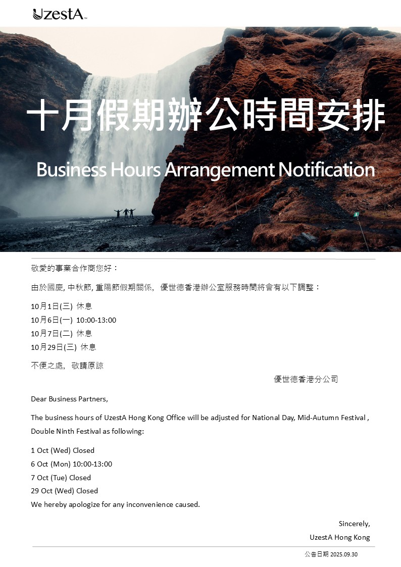 公司公告, 最新消息十月假期辦公時間安排2025 年 9 月 30 日 Posted by twsupport@uzesta.com 30 9 月 適逢國慶,中秋節,重陽節假期關係,優世德香港辦公室服務時間將會有以下調整,相關訊息請參閱附檔 !