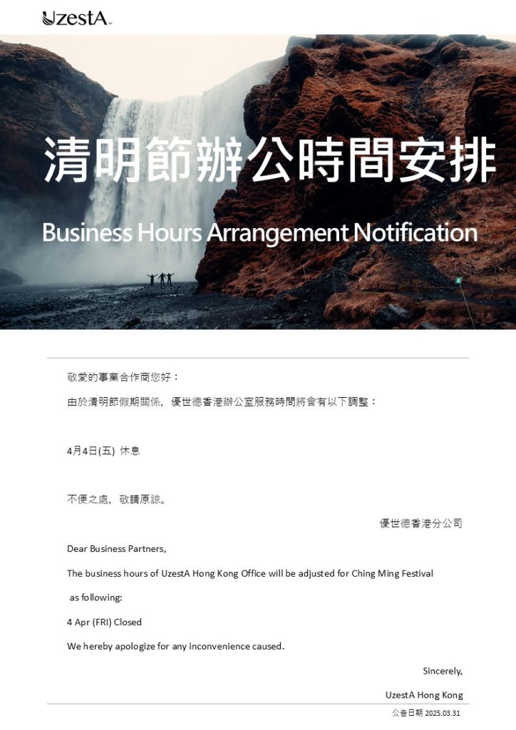 28 3 月 公司公告, 最新消息 清明節辦公時間安排2025 年 3 月 28 日 By kevin.su@uzesta.com Facebook Twitter Line WhatsApp Copy URL 清明節辦公時間安排Continue reading
