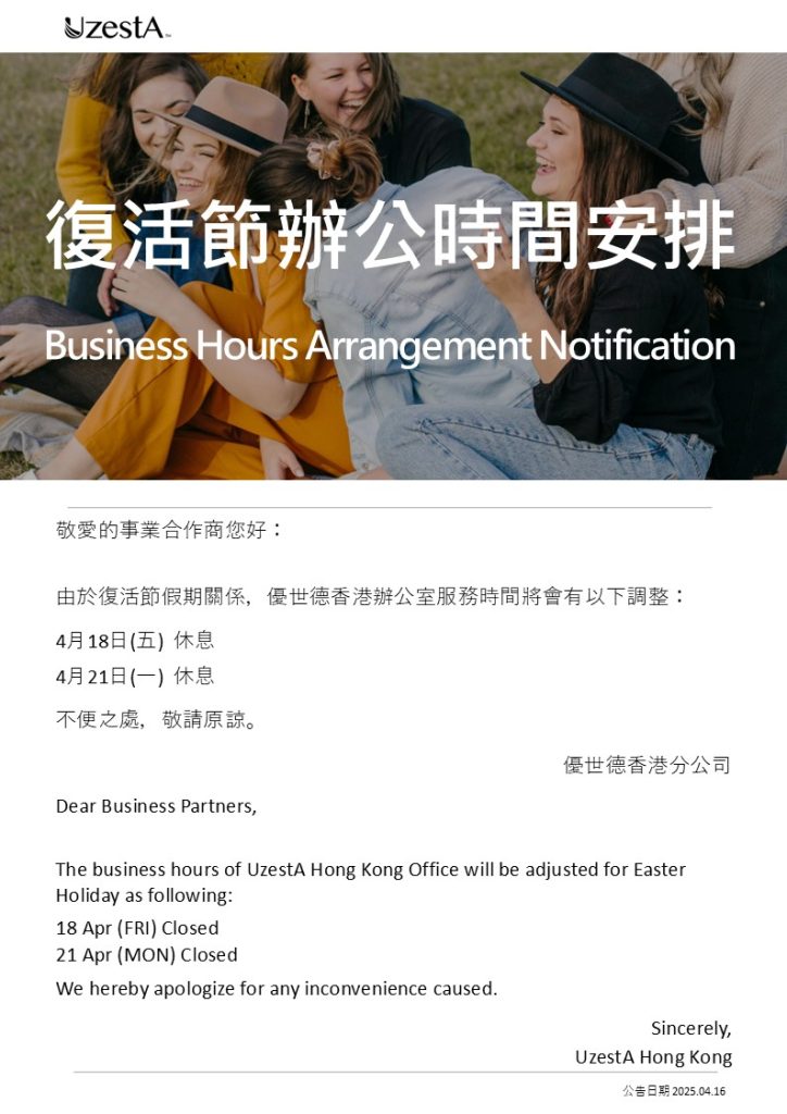 16 4 月 公司公告, 最新消息 復活節辦公時間安排2025 年 4 月 16 日 By kevin.su@uzesta.com Facebook Twitter Line WhatsApp Copy URL Continue reading