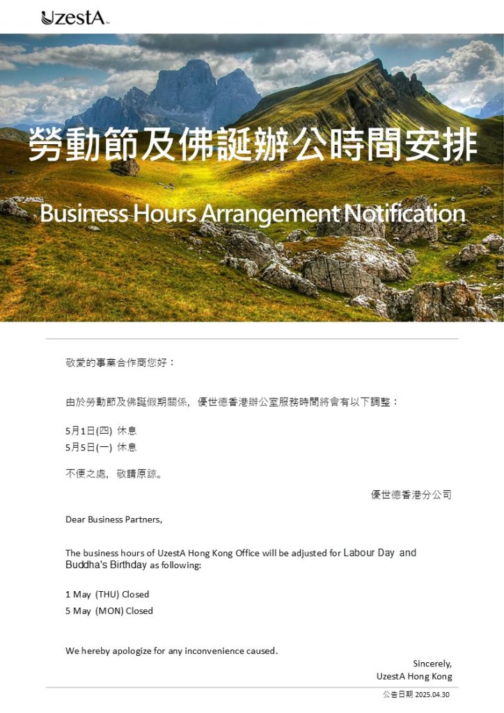 02 5 月 公司公告, 最新消息 勞動節與佛誕辦公時間安排2025 年 5 月 2 日 By kevin.su@uzesta.com Facebook Twitter Line WhatsApp Copy URL 勞動節與佛誕辦公時間安排Continue reading